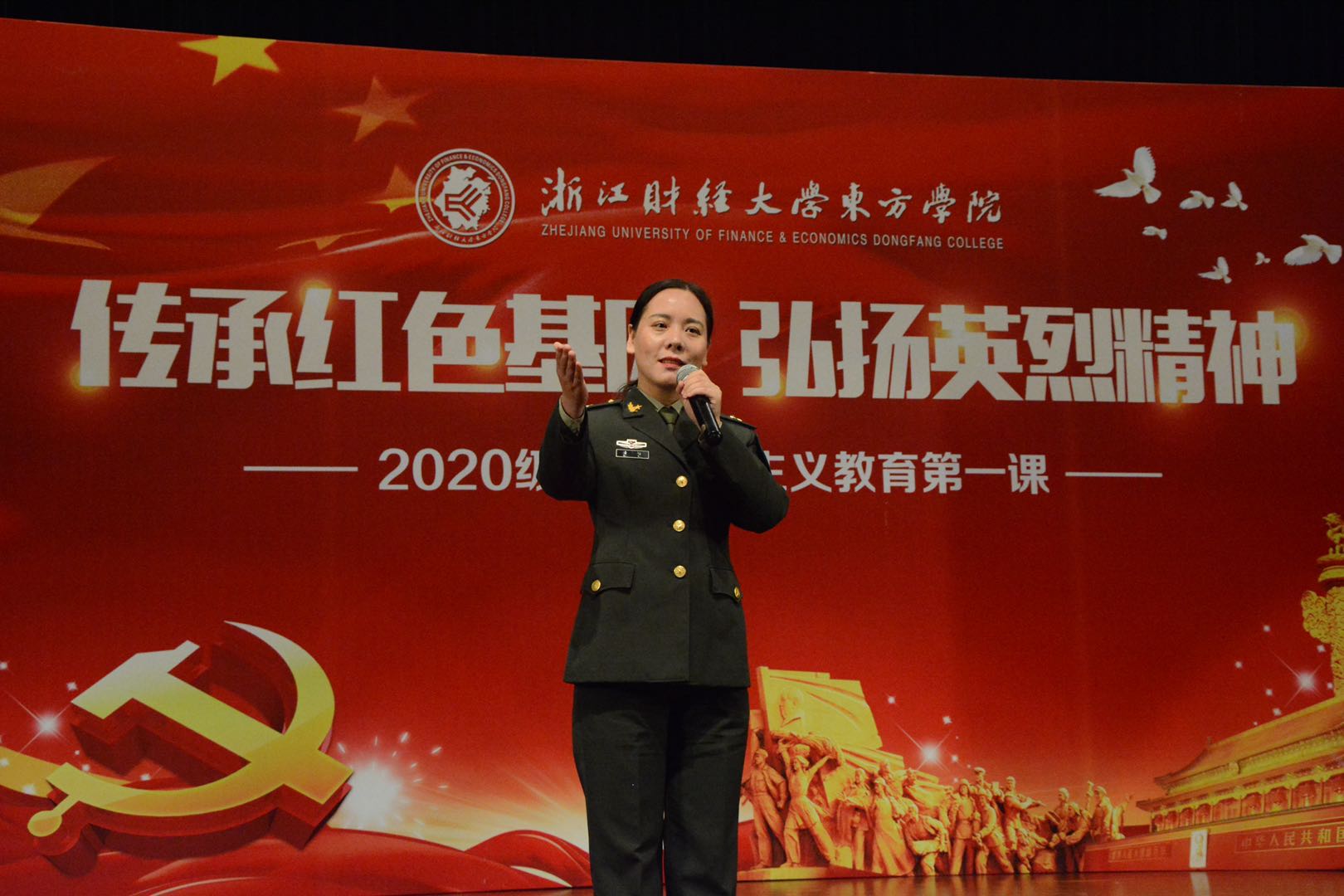 10月20日下午,由浙江革命烈士纪念馆,浙江财经大学东方学院马克思主义学院、国防教育学院联合策划举办的《传承红色基因弘扬英烈精神》主题爱国主义教育第一课在影剧院顺利召开。浙江革命烈士纪念馆副馆长万晓青,来自省内各地革命烈士纪念馆选拔出来的9名优秀讲解员,以及法政学院、学生工作部相关负责人出席本次活动。