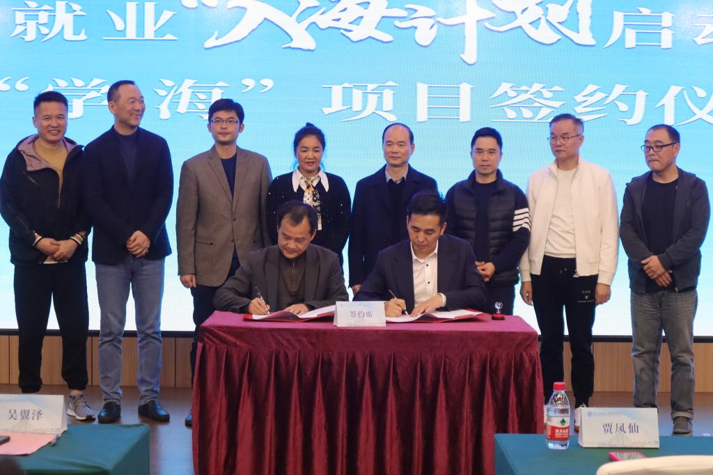 吴翼泽和蒋钰明为贾凤仙、陈克川、黄卫斌、李强、柴国荣、糜江丰、朱卫明、骆国青8位企业家颁发“学·海”导师聘书。学生工作部负责人方志勇与海宁市学习型企业家协会副会长糜江丰代表双方单位签约。与会领导共同见证签约仪式。