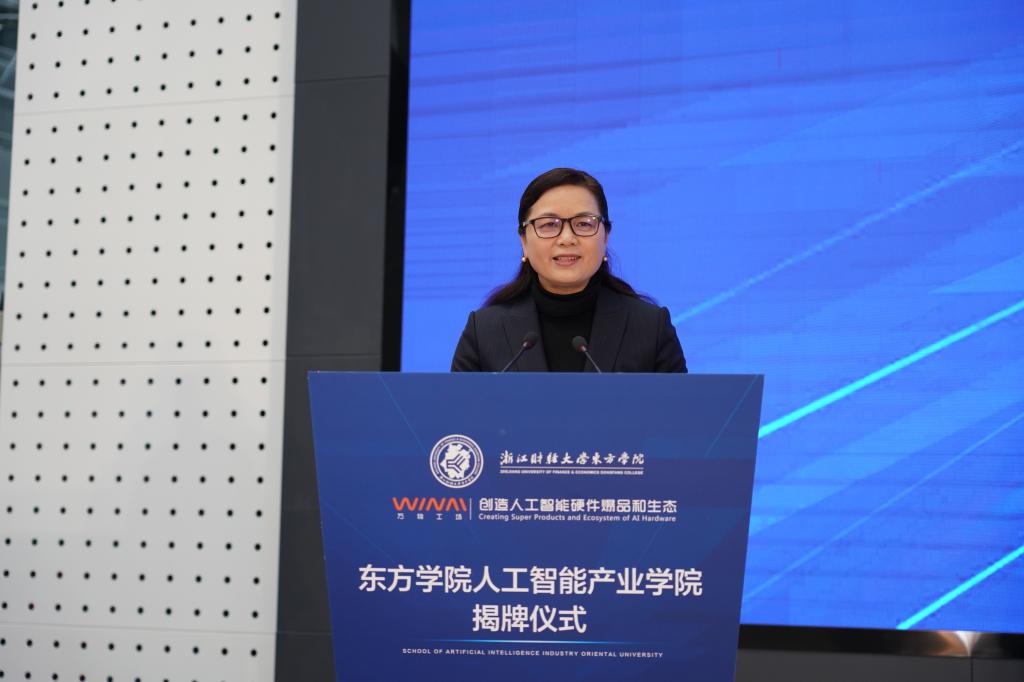 顾煜峰代表海宁经济开发区向产业学院的成立表达祝贺。他表示,在东方学院、万物工场、开发区以及各企业的通力合作下,共同建设好人工智能产业学院,努力构建产教融合、共同育人的“命运共同体”,共同解决招才难、育才难、留才难三大企业难关,最终可实现助力企业和开发区经济发展的目标。