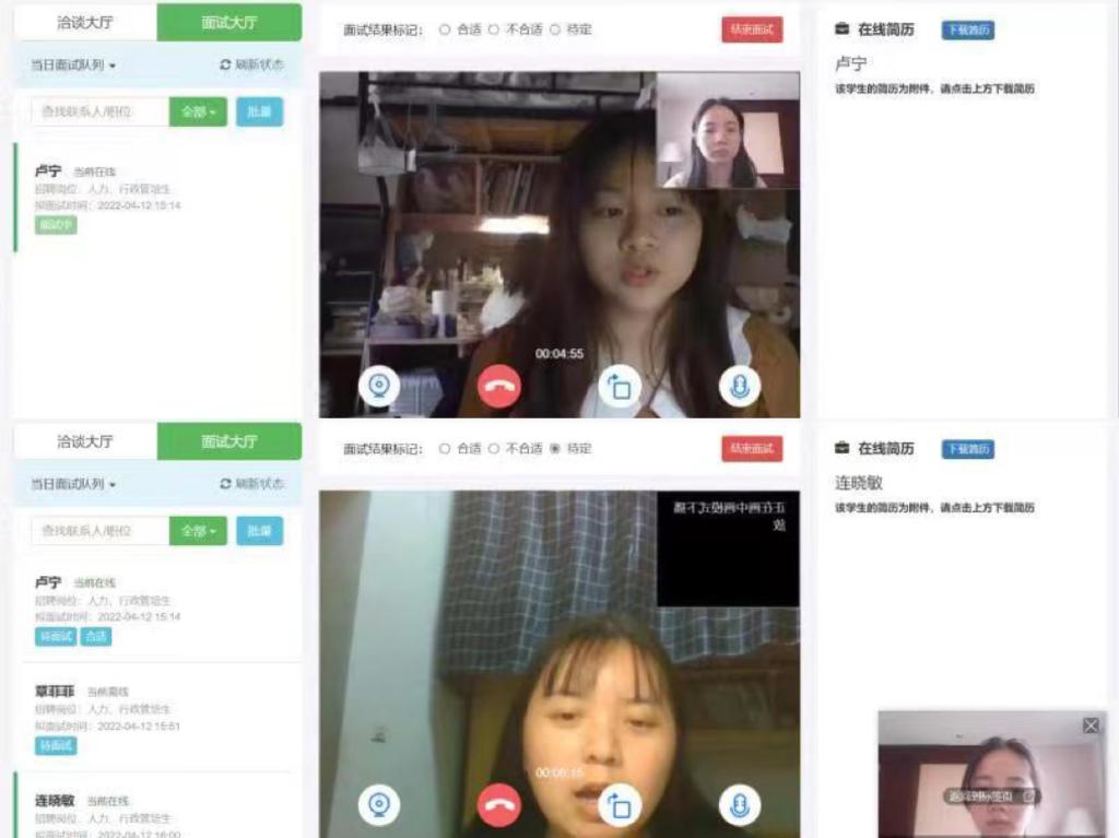 本次网络招聘会同步开通了导师面对面线上咨询通道,学院邀请了6位师友计划平台导师,帮助学生做好大学生涯规划、职业规划,完善简历制作,提升面试技巧等。导师通过视频连线的方式,打破空间壁垒,在当下疫情封闭形势下为同学们的就业生涯指点迷津。