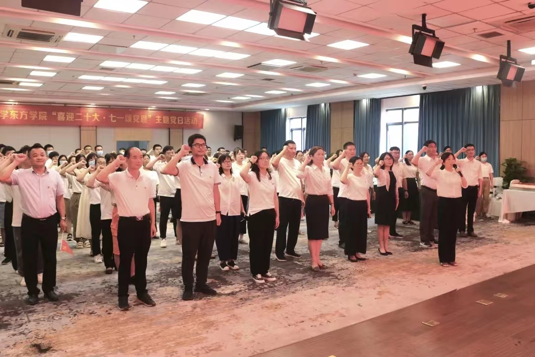 6月30日,学院在行政楼B301举行“喜迎二十大 七一颂党恩”主题党日活动,学院领导班子成员,学院党员代表等90余人参加了此次活动。“我志愿加入中国共产党,拥护党的纲领,遵守党的章程,履行党员义务……”在鲜红的党旗前,申屠莉书记带领全体党员集体宣誓,党员干部庄严肃立,面对党旗,举起右拳,重温入党誓词,重忆入党初心。誓言句句铿锵,党员干部以最庄严的方式表达对党的热爱和祝福,将对党忠诚化为勇担使命的强大动力。