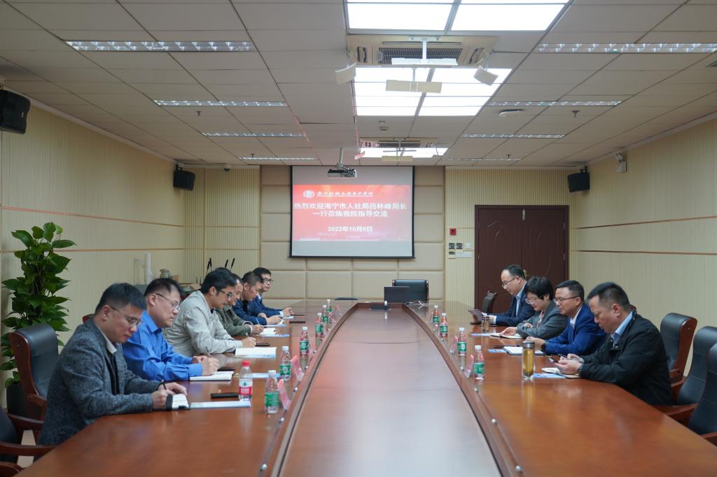 10月8日下午,海宁市人社局吕林峰局长带队,海宁市人社局副局长沈燕明、海宁市就业中心主任沈炳良、海宁市嘉睿人力资源公司总经理沈立峰一行来学院调研交流大学生就业创业相关事宜,学院党委副书记吴翼泽热情接待了来访客人。