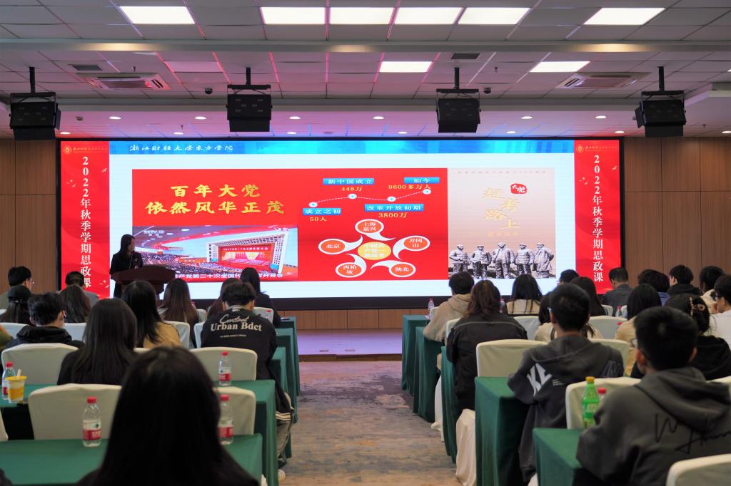 申屠莉从“中国这十年”“浙江这十年”“东方这十年”三个角度来感悟时代印记,系统阐述了在我们党带领下,十年来,神州大地上发生的豪迈变革,浙江体系化推进“八八战略”后的蝶变式发展,东方学院内涵式高质量发展。从“提升学生幸福指数、搭建育人实践平台”两个维度阐述了遇见东方之美,做好学院“大思政课”建设,聚焦立德树人根本任务,建设“大课堂”、搭建“大平台”、建好“大师资”,推动思政小课堂与社会大课堂相结合,促进学生德智体美劳全面发展。