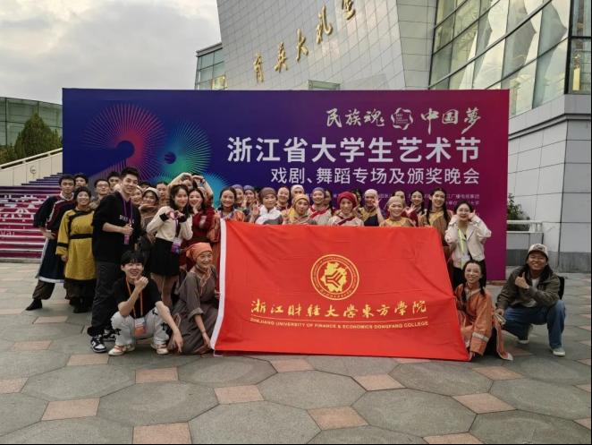 浙江省大学生艺术节是全省高校美育成果的集中展现,为全省高校学生搭建了展示青春风采的舞台。本次艺术节成绩的获得,体现学院五育并举工作成效。舞台上,浙财东方青年将时代背景、切身故事和表演艺术融为一体,怀揣对艺术的饱满热情,将当代大学生与党同行、与祖国同行、与时代同行的信念贯穿始终,以昂扬向上的精神风貌和奋发有为的理想追求为党的二十大献礼,让青春在不懈奋斗中绽放绚丽之花。