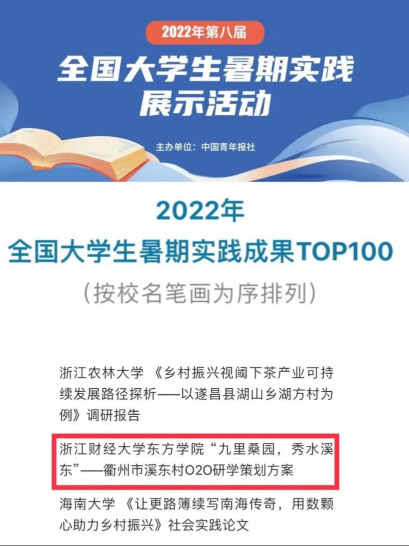 为更好挖掘和展现大学生暑期实践优秀成果,近日,由共青团中央青年发展部、中国青年报、中国青年网共同举办的2022年第八届全国大学生暑期实践展示活动获奖名单正式公布,学院工商管理学院赴衢州开化县溪东村“乡村振兴”实践服务团在千所高校的实践队伍中脱颖而出,该团队荣获“2022年第八届全国大学生暑期实践百强成果”称号。