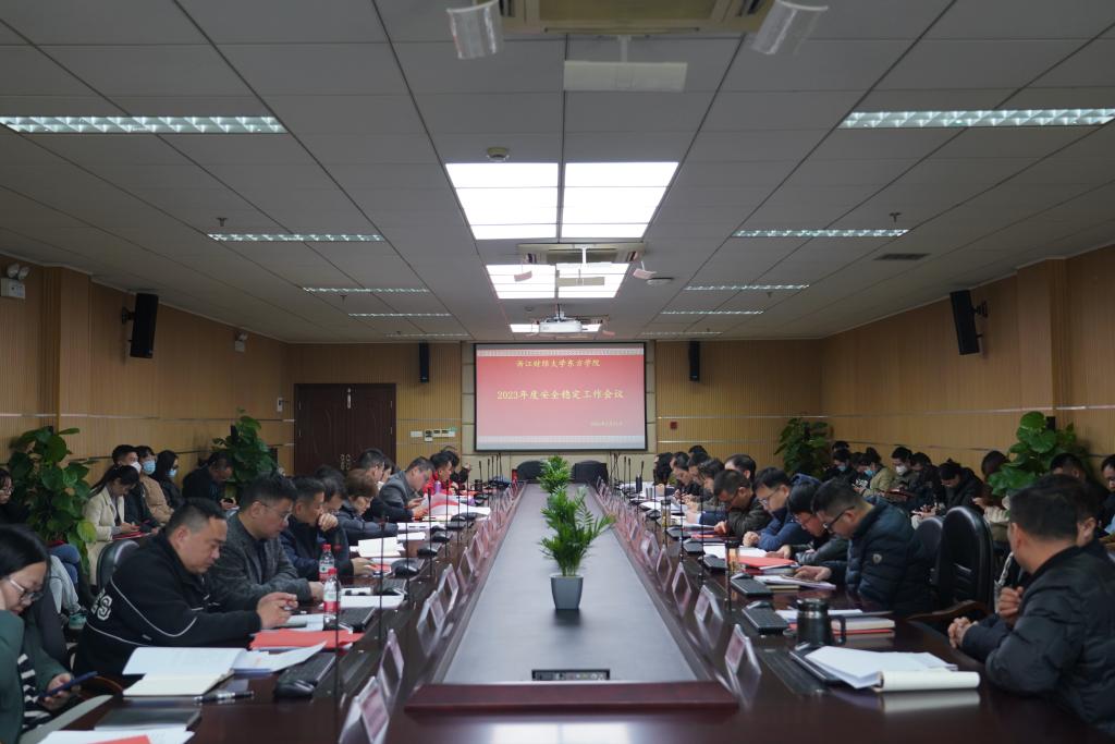 张伟飚从“提高安全责任感,全力打造和谐平安校园”“齐心协力抗新冠,高分交出防疫工作答卷”“健全安全管理体系,规章制度及时修订完善”“强化安全工作基础,安全管理水平明显提升”等四个方面深入总结了2022年学院安全稳定工作和取得的成绩,并对2023年度安全稳定工作提出明确要求。一是要提高政治站位,加强校园安全维稳力度。坚持大局思维,统筹发展和安全,加强重点时段校园安全防范,增强安全责任担当,全力维护校园平安有序;二是要紧盯关键环节,狠抓安全隐患排查落实。查找薄弱环节,堵塞安全管理漏洞,切实完善风险防控体系,有效落实各项安全措施;三是要提升防范意识,全面开展安全宣传教育。统筹谋划、合理安排、积极有序开展活动。压实责任、加强督导、不断提升反诈成效。有机结合、自主管理、重点落实新生始业教育;四是要把握工作重点,建立安全管理长效机制。完善安全规章制度,落实工作制度化管理。加强“三防”建设水平,提升校园反恐防暴能力。着眼演练实战导向,推进应急处突维稳体系。