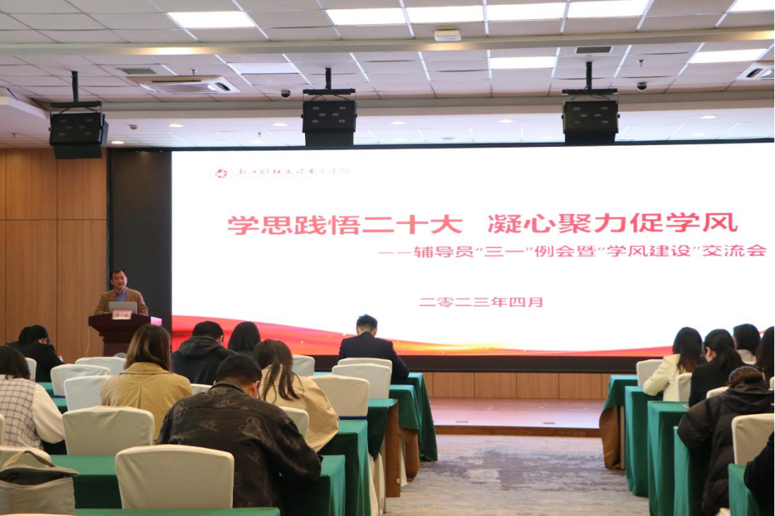 为深入开展学习贯彻习近平新时代中国特色社会主义思想主题教育,有力推进学院优良学风建设,持续深化“一三五九”学生全面发展教育体系建设,4月27日下午,学院在B301组织开展了“学思践悟二十大,凝心聚力促学风”的学风建设交流会。学生工作部、院团委相关负责人及全体成员、各二级学院分管学生工作书记(或副书记)及全体辅导员参加了会议。