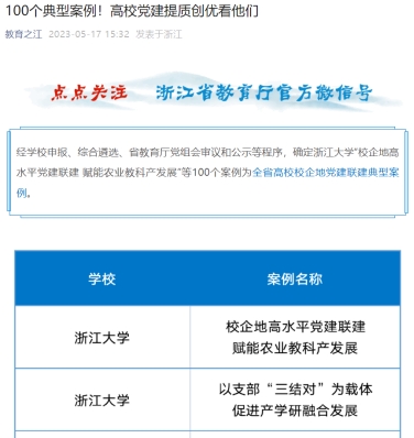 近日,浙江省委教育工委公布全省100个高校校企地党建联建典型案例名单,学院申报的《五大工程聚合力 互联共建促发展》项目成功入选。