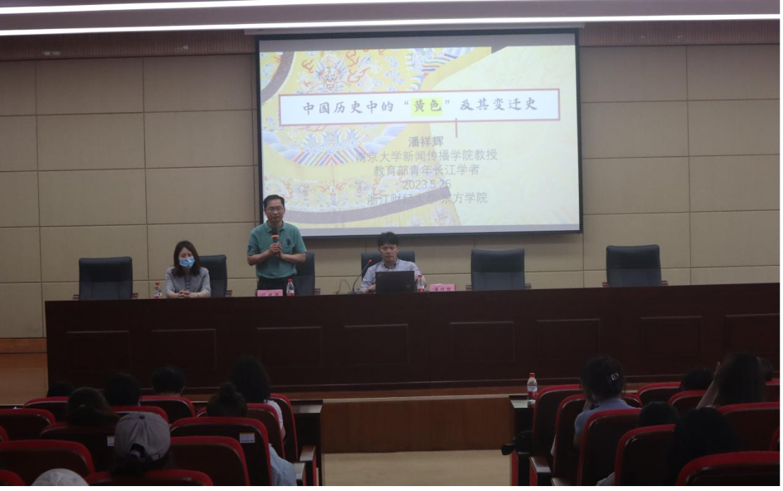 潘祥辉为学生们开展了一场主题为“一个中国历史中的‘黄色’及其变迁史”的讲座。讲座从媒介之颜色维度,用大量的史料为证,点出中西方文化中黄色的不同含义,并重点论述了中国古代文明中以黄为尊的发展历史。