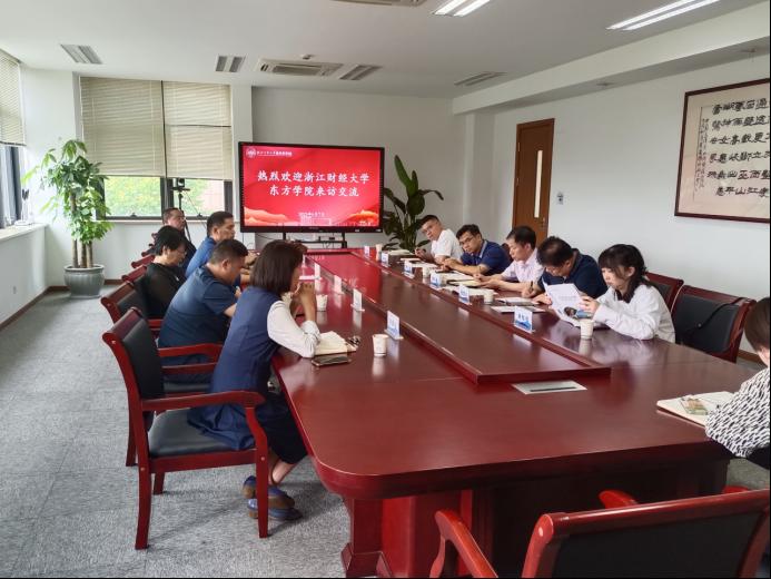 张伟飚对浙江工商大学杭州商学院的热情接待表示感谢,介绍了学院的历史发展、机构设置、人才培养模式、校企合作、校地合作、产业学院建设等情况。