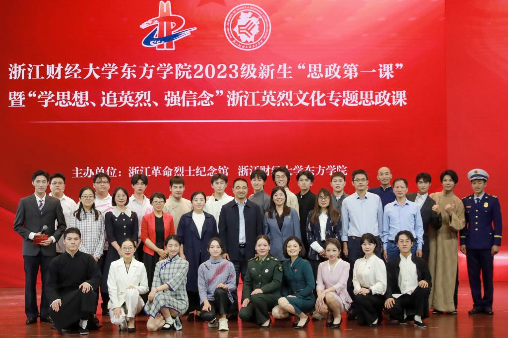 为进一步推进“大思政课”建设,以红色信念引领当代青年勇做习近平新时代中国特色社会主义思想信仰者和实践者。10月10日,由浙江革命烈士纪念馆、浙江财经大学东方学院主办的“学思想、追英烈、强信念”浙江英烈文化专题思政课在影剧院开讲。浙江革命烈士纪念馆馆长张海波、副馆长万晓青,浙江财经大学人文与传播学院党委书记高燕、数据科学学院党委副书记何露霞,学院领导申屠莉、马雪英、方咏、林香娥、吴翼泽、张伟飚,党群部门和二级党组织书记负责人、全体辅导员、教师代表、2023级新生代表等近千人参加活动。