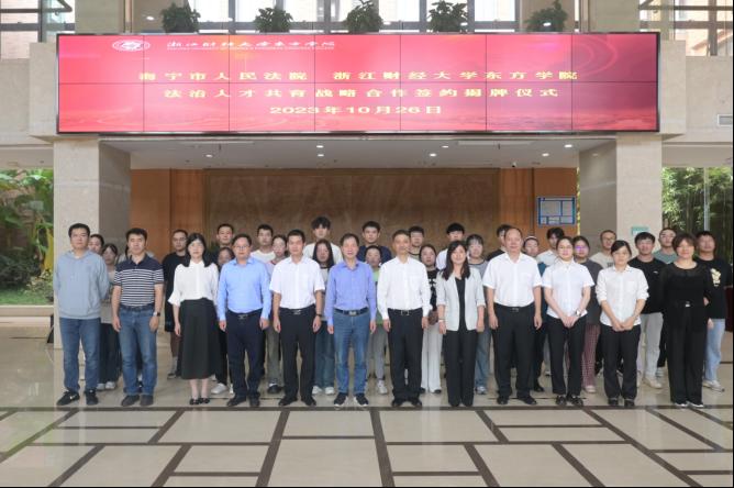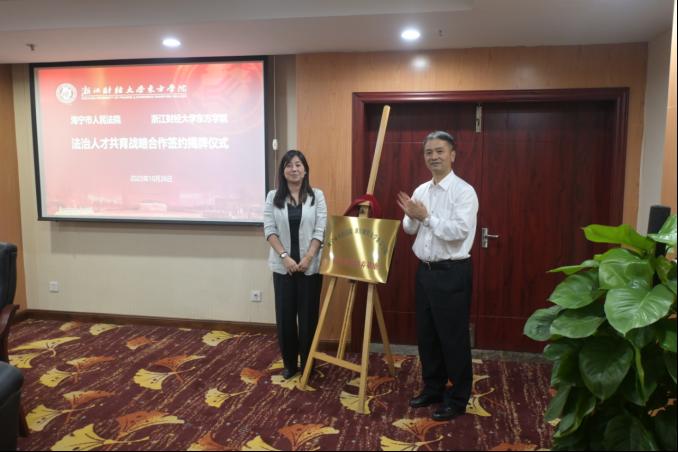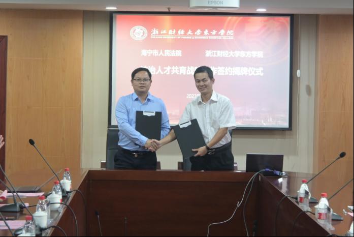 10月26日,学院与海宁市人民法院在学术中心第三会议室举行了海宁市人民法院、浙江财经大学东方学院“法治人才共育战略合作”签约揭牌仪式。海宁市人民法院党组书记、院长王建强,学院党委书记申屠莉、副院长张伟飚,海宁市人民法院党组成员、政治部主任宋杰,海宁市人民法院长安法庭庭长张辉,海宁市人民法院政治部副主任何素静、海宁市人民法长安法庭副庭长范凤佳,法政学院负责人及师生代表40余人参加仪式。