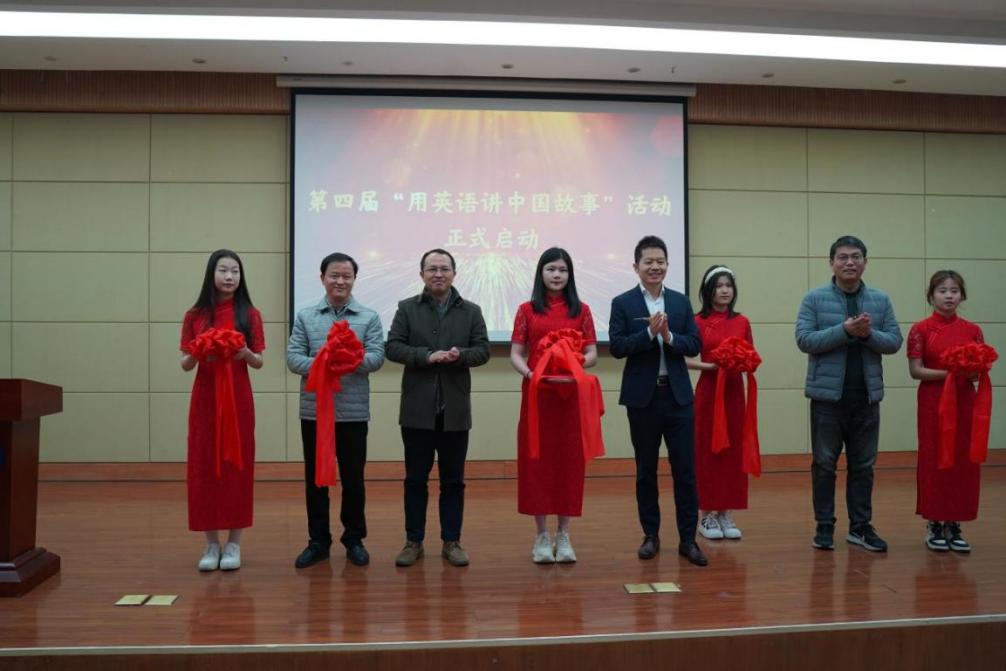 童志锋、金国锋、吴勇、外国语学院院长张友文为第四届“用英语讲好中国故事”活动剪彩。