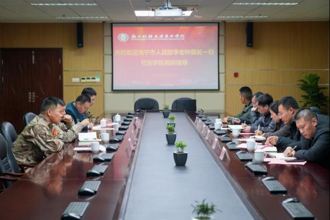 2月28日,海宁市人武部领导李宏林一行来学院调研交流人武工作,学院党委书记申屠莉、副书记汪风易,学院副院长张伟飚,学生工作部负责人参加调研。
