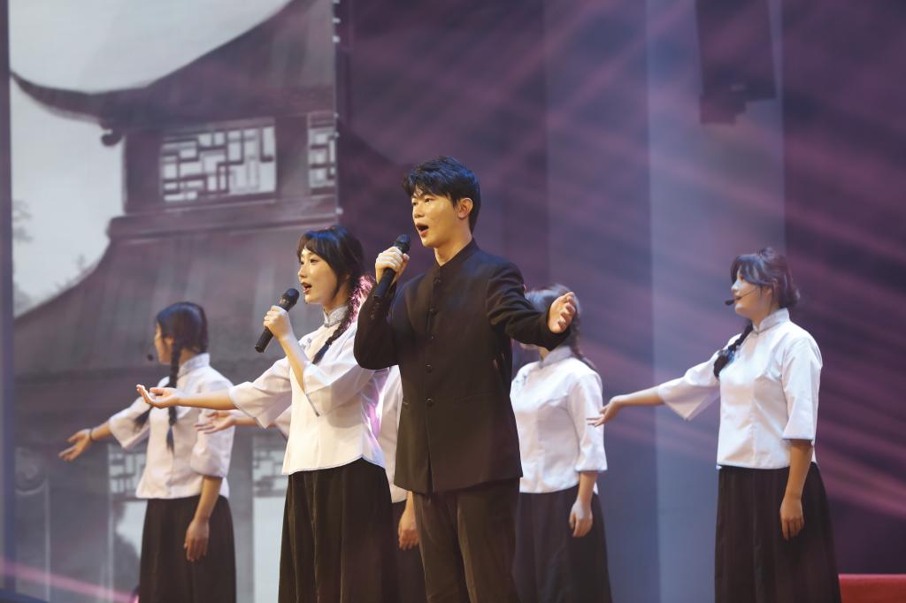 学院马克思主义学院选送合唱《送别》作为开场节目拉开帷幕,瞬间将观众带回烽火连天的抗战岁月;以朱枫、王伟等十位浙江籍烈士为代表的朗诵《我们不会忘记》,生动再现了浙江抗战烈士们的英勇无畏。演出融合音乐、戏剧、朗诵等多元艺术形式,既有历史场景的深情复现,也有英烈精神的当代解读,现场官兵在光影交错中感受信仰力量,感悟“党旗所指、赤诚所向”的革命情怀。