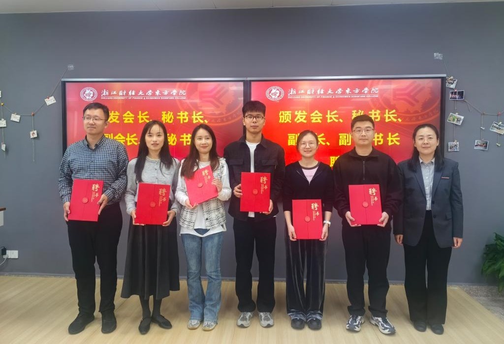 与会人员共同审议并通过《浙江财经大学东方学院上虞校友会章程》及《浙江财经大学东方学院上虞校友会第一届理事会名单》,选举产生首任会长、秘书长、副会长、副秘书长及理事。其中,2010级劳动与社会保障专业校友钱卓琦当选会长,苗露当选秘书长。方咏和团委书记宣刚为理事会成员颁发聘书,伏晓红为上虞校友会授旗。学工部部长许乐代表学院校友会宣读贺信。