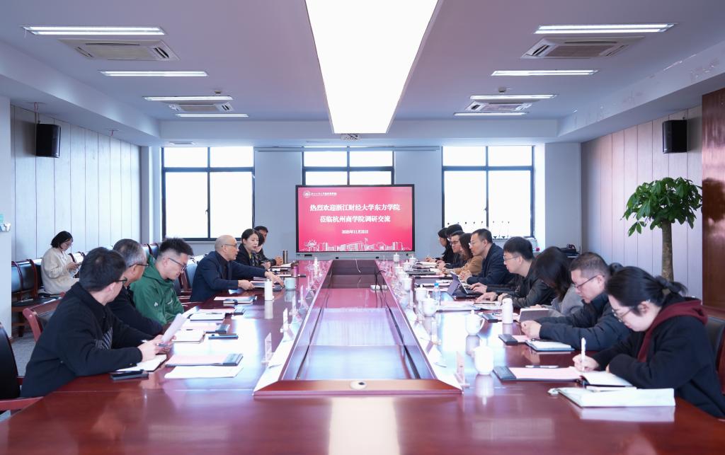 11月25日,学院党委副书记汪风易、副院长张伟飚带队赴浙江工商大学杭州商学院调研,受到浙江工商大学杭州商学院党委副书记章晓乐、副院长倪丽敏及相关部门热情接待。