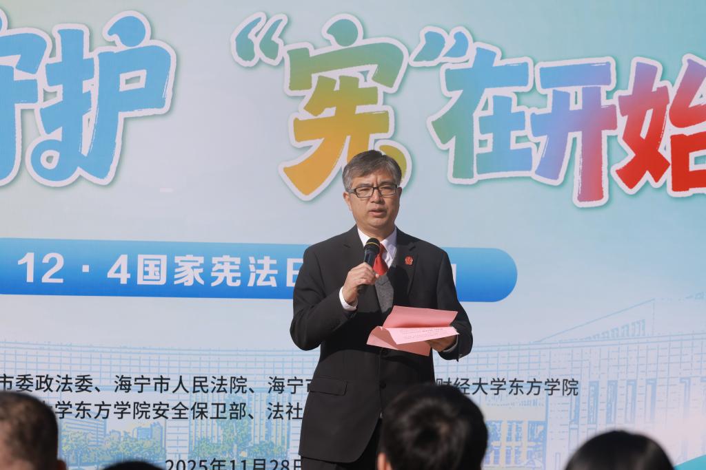11月28日,由海宁市政法委、海宁市人民法院、海宁市司法局联合学院主办,安全保卫部、法社学院承办的“一生守护,‘宪’在开始”——12·4国家宪法日主题活动在学院小广场顺利举办。学院副院长张伟飚,海宁市法院审判委员会专职委员郭百顺,海宁市司法局党委委员、政治处主任王亮,海宁市委政法委平安综治督导室主任杜泽翼,组宣部、团委、科技部、安全保卫部、法社学院相关负责人,平安驿站站长等出席活动。