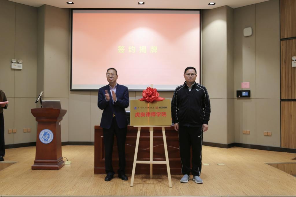 在与会人员的共同见证下,法社学院院长邵培樟与金虎良代表双方签署共建协议,并为“虎良律师学院”揭牌。