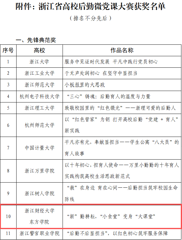 近日,由浙江省教育后勤基建协会思想文化与人力资源管理专业委员会主办的2025年浙江省高校后勤微党课大赛评选结果正式揭晓。学院后勤基建部党支部报送的微党课作品《“新”勤耕耘,“小食堂”变身“大课堂”》从众多参赛作品中脱颖而出,荣获“先锋典范奖”。