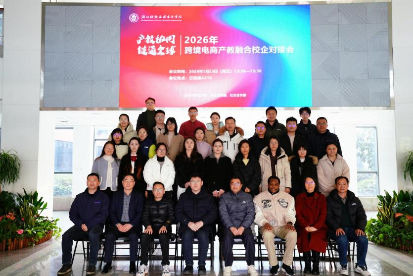 1月23日,学院2026年跨境电商产教融合校企对接会顺利举行。本次会议以“产教协同 链通全球”为主题,围绕跨境电商人才培养、产教融合模式及企业实习实训等内容展开深入交流。学院副院长张书铭,浙江省海宁市商务局粮食管理科科长张玉峰,教务部、社会合作部、金融与经贸学院相关负责人,16家企业代表及多位教师代表参加会议。