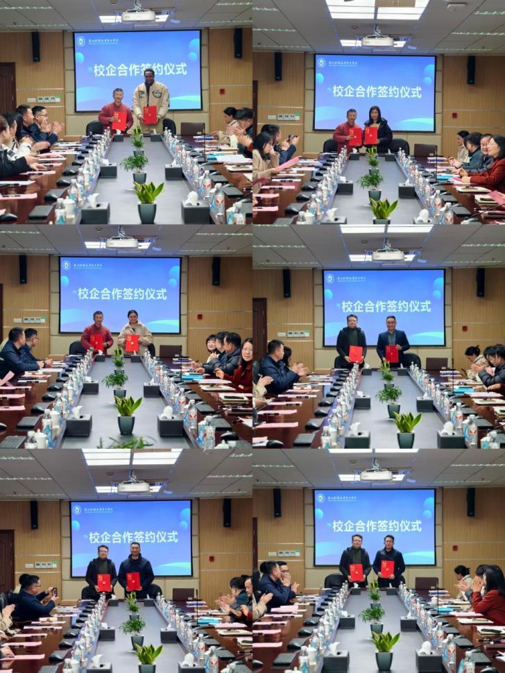华尔科技集团股份有限公司、海宁江森人造草坪有限公司、海宁市新光源照明科技股份有限公司等六家企业代表与学院代表现场签订实习基地协议。