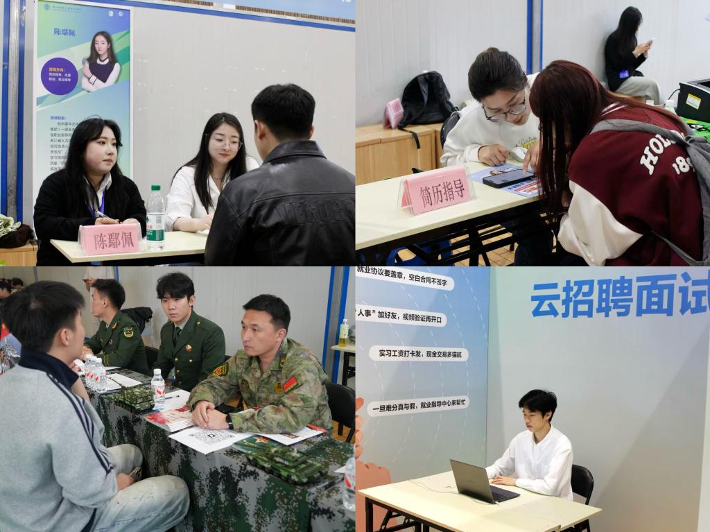为提升人岗匹配效率,推进专业化、精准化、智能化的就业服务,招聘会现场还集中设置导师面对面专区、AI赋能体验区、简历优化专区、云招聘面试间等多个就业服务板块,覆盖基层就业、考公考研、应征入伍、出国出境等全维度就业需求。来自高校、地方、企业的就业指导专家现场“坐诊”,为学生求职“把脉支招”,全面提升求职竞争力。