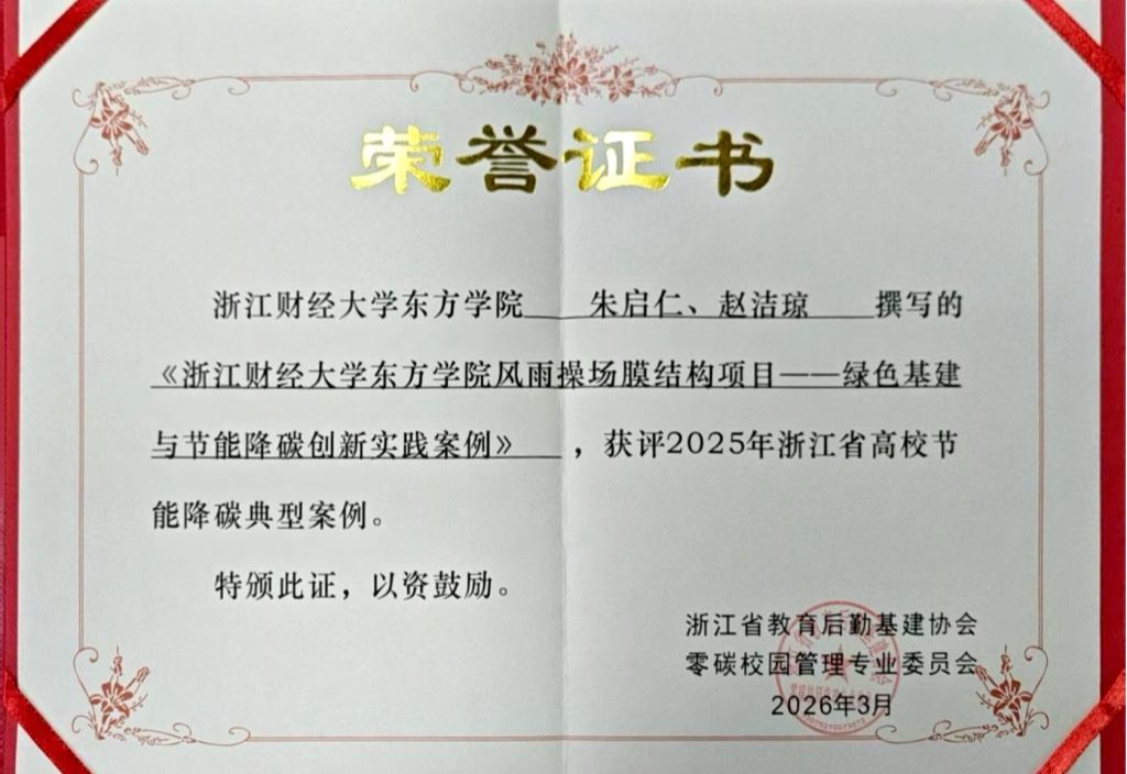 近日,浙江省教育后勤基建协会零碳校园管理专业委员会一届四次成员代表大会暨低碳学校建设工作研讨会在丽水学院召开。会上,学院风雨操场膜结构项目凭借其在绿色建筑、节能降碳方面的创新设计与显著成效,成功入选2025年浙江省高等学校节能降碳典型案例。