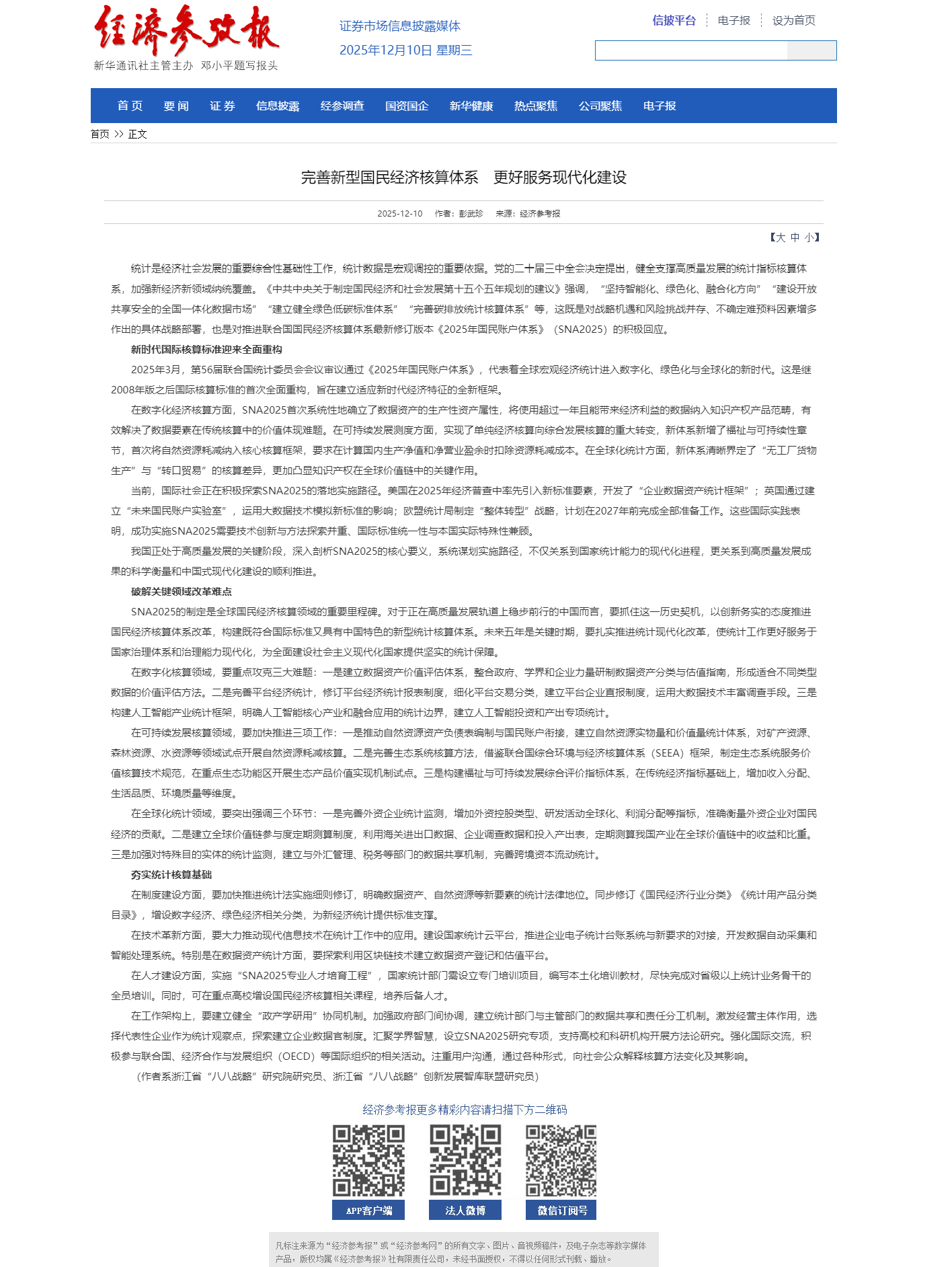 近日,信智学院教师彭武珍在《经济参考报》发表《完善新型国民经济核算体系更好服务现代化建设》理论文章。《经济参考报》是新华通讯社主管主办的全国性经济类报纸,创刊于1981年7月1日,是中国最早的全国性经济类报纸,报名由邓小平题写。作为中国证券市场法定信息披露媒体之一,该报以“高端财经+参考性”为特色,聚焦深度报道、观点报道和国际报道。2024-2025年连续两年入选中国知网“高学术影响力中国报纸”。