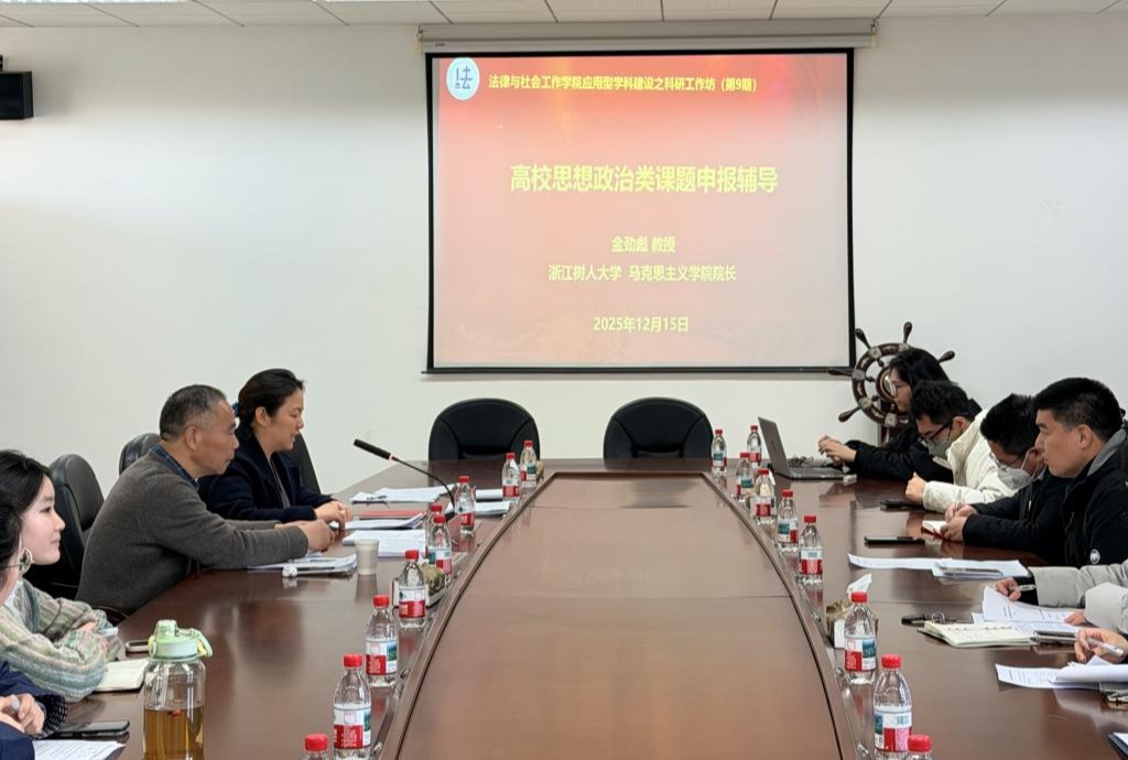 12月15日,法社学院在5J-502会议室举办思政类课题专家辅导活动暨第九期科研工作坊。活动特邀浙江树人大学马克思主义学院院长、国家社科基金评审专家金劲彪教授担任辅导主讲人,法社学院思政课专任教师、及思政类课题申报意向教师20余人参加活动。