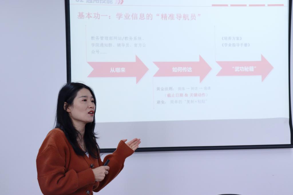 第三期培训特邀教务部副部长王侦以“赋能班级成长,引领朋辈成长”为主题开展授课。她结合教务管理工作实际,从班级学风建设、学业帮扶机制、朋辈互助引导等方面,分享了促进班级整体进步的有效路径。她强调班长应成为连接学院教学管理与学生学习需求的纽带,通过精准赋能助力班级形成勤学善思的良好氛围,同时在引领朋辈共同成长中实现自身价值。